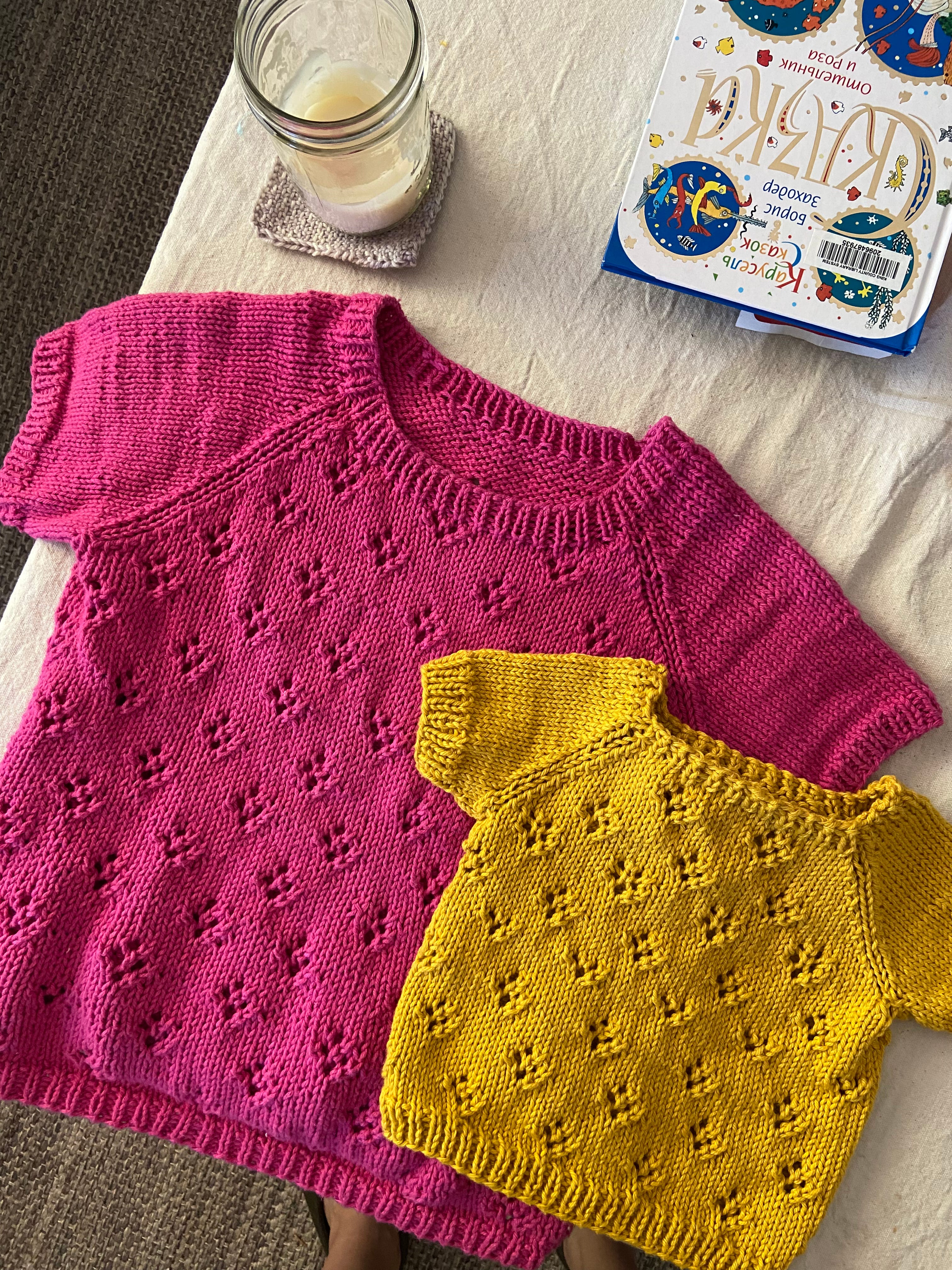 This is the Rigmor Summer Blouse pattern by Petite Knit, knit with Queensland Coastal Cotton in Magenta and Goldenrod. My gauge was larger with this yarn so I sized down for the girls. I made the 4-5yo size and the 0-3mo size.